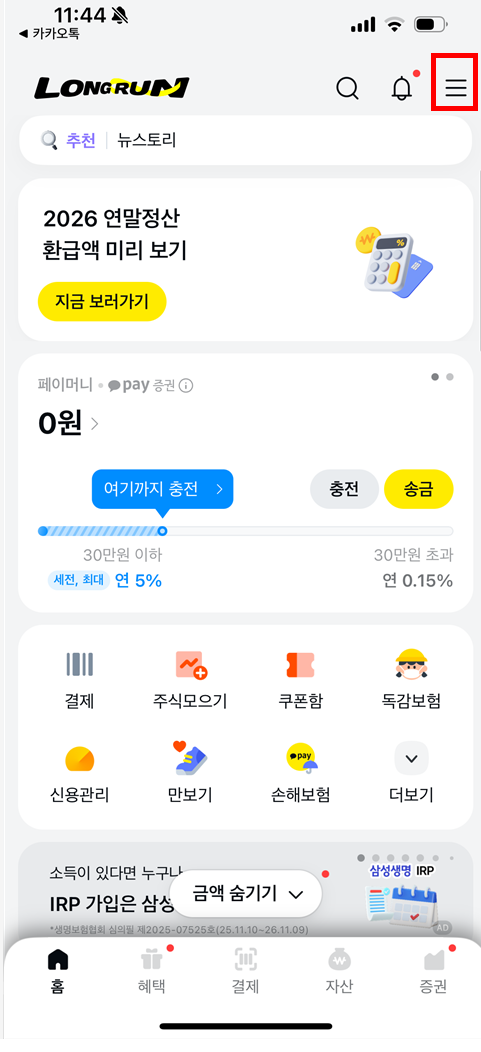 2) 카카오페이 홈 화면 진입 → 우측 상단 전체메뉴 삼선 아이콘 터치
