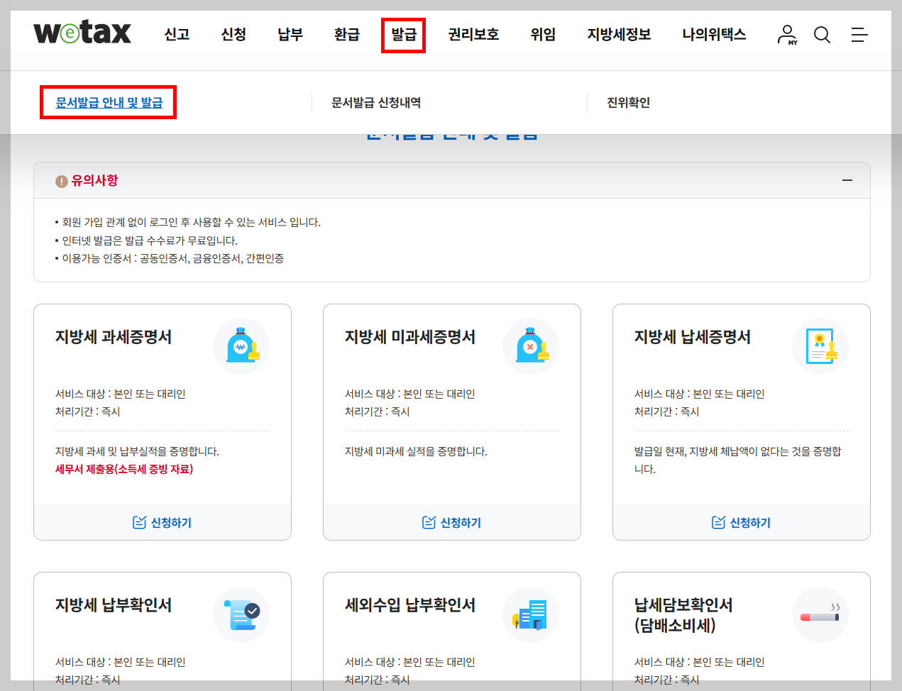 | 지방세 완납증명서(전국) | 위택스 → 발 → 문서발급 안내 및 발급 | 전국 지자체용 완납증명 |
