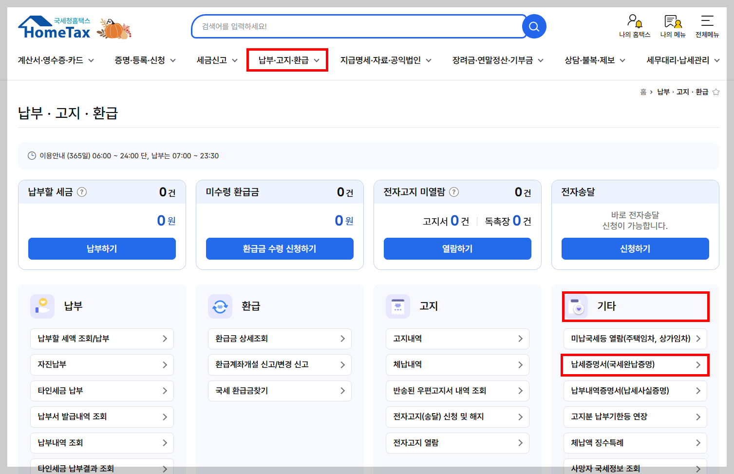 | 국세 완납증명서 | 홈택스 → 납부·고지·환급 → 기타 → 납세증명서(국세완납증명) | 금융기관 제출, 정부지원금, 사업자 등록 등 |