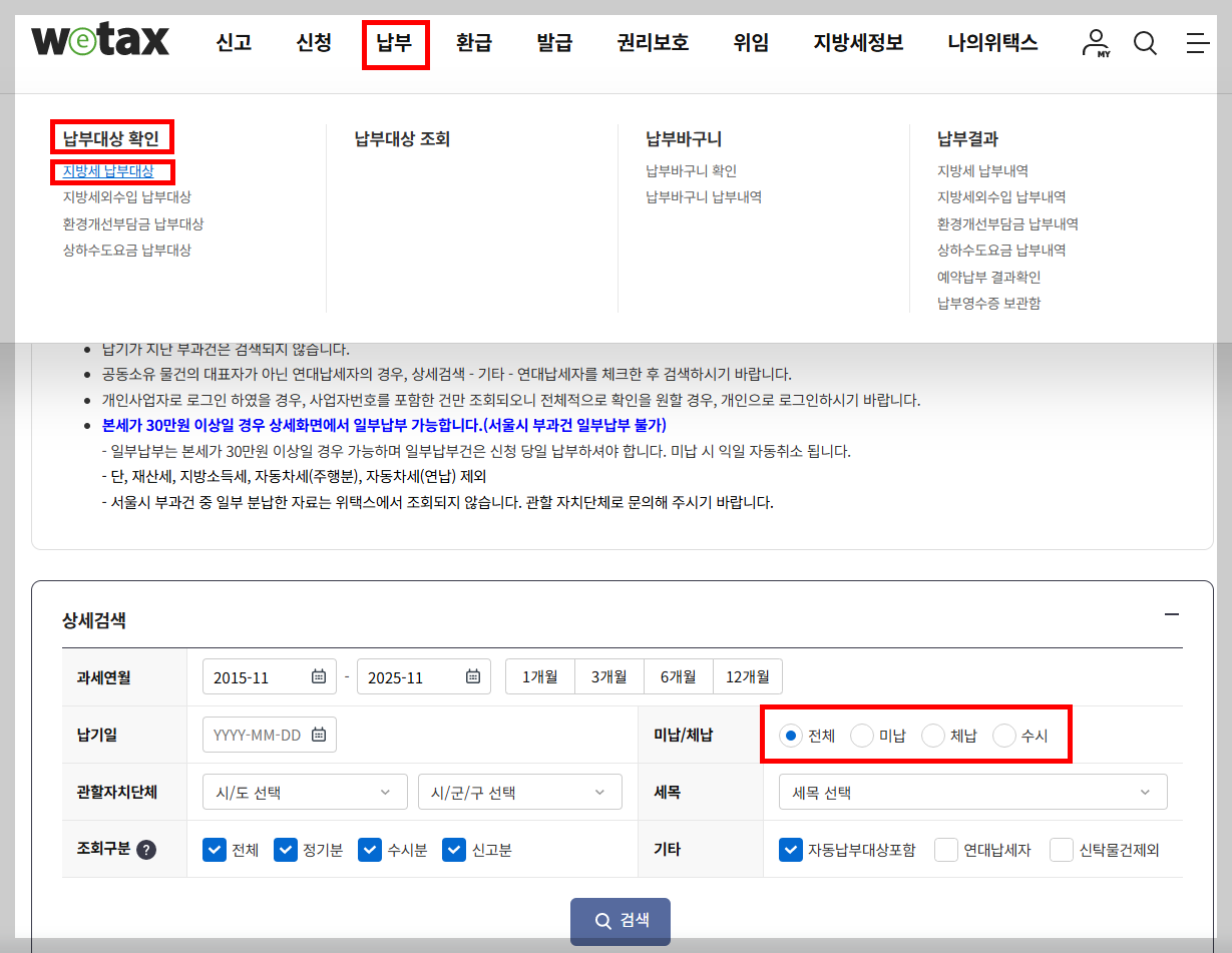 | 지방세(전국) | 위택스 → 납부 → 납부대상확인 → 지방세 납부대상 | 재산세·자동차세·주민세 등 전국 미납 현황 |