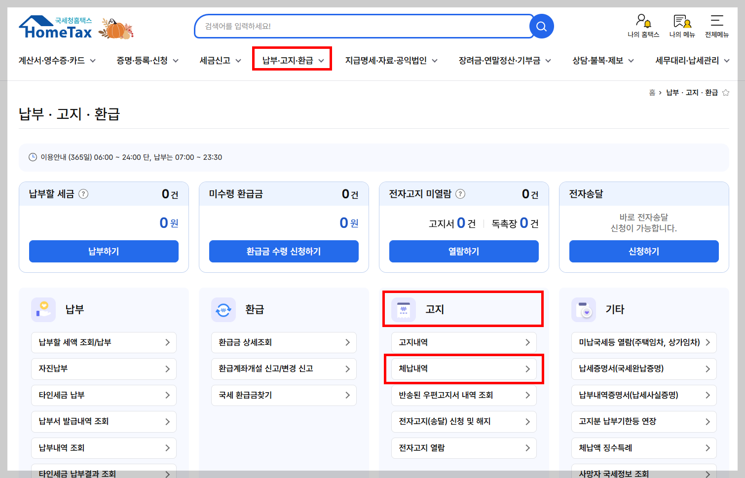 | 국세 | 홈택스 → 납부·고지·환급 → 고지 → 체납내역 | 미납 금액, 체납 여부, 전자납부번호 |