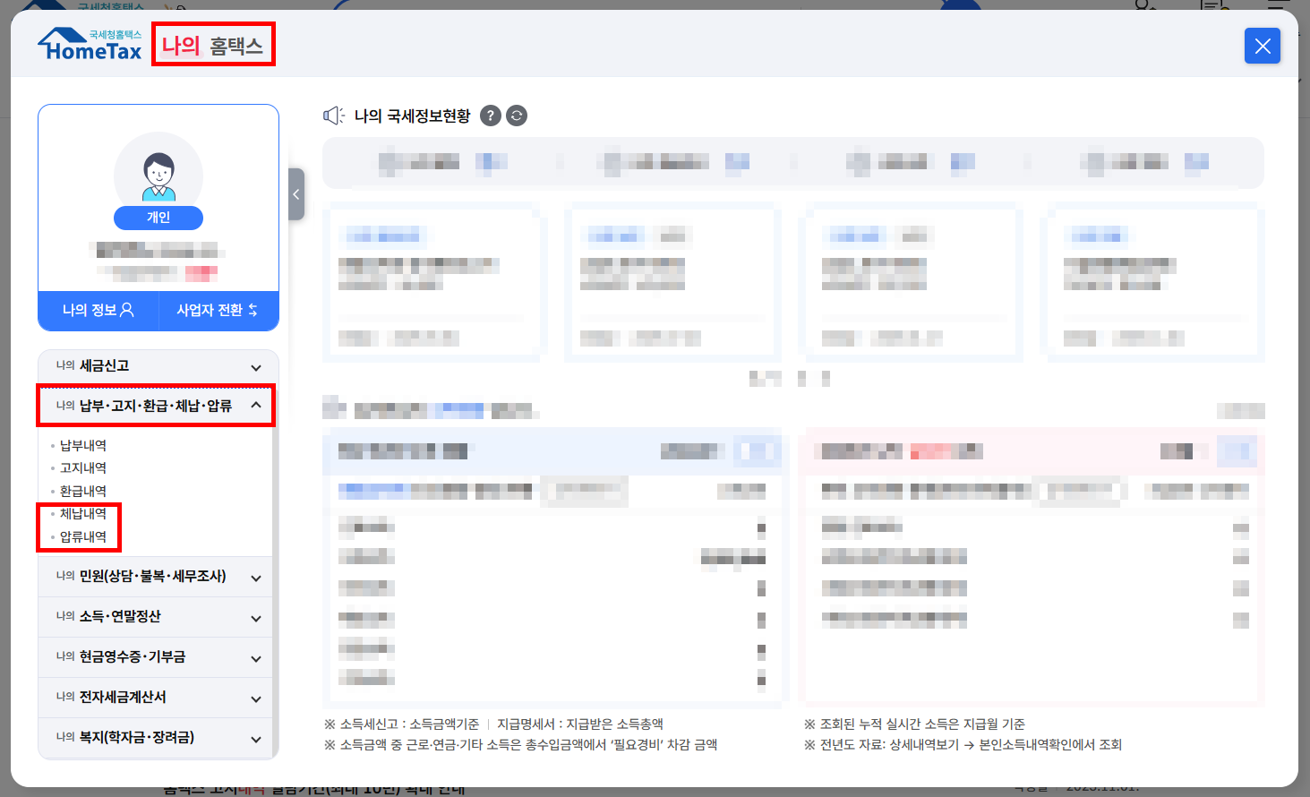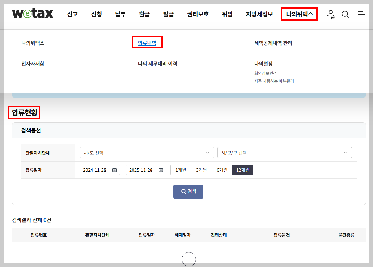② 🔗홈택스 → 로그인 → 우측 상단의 '나의 홈택스' → 납부·고지·환급·체납·압류 → 체납내역(압류내역)