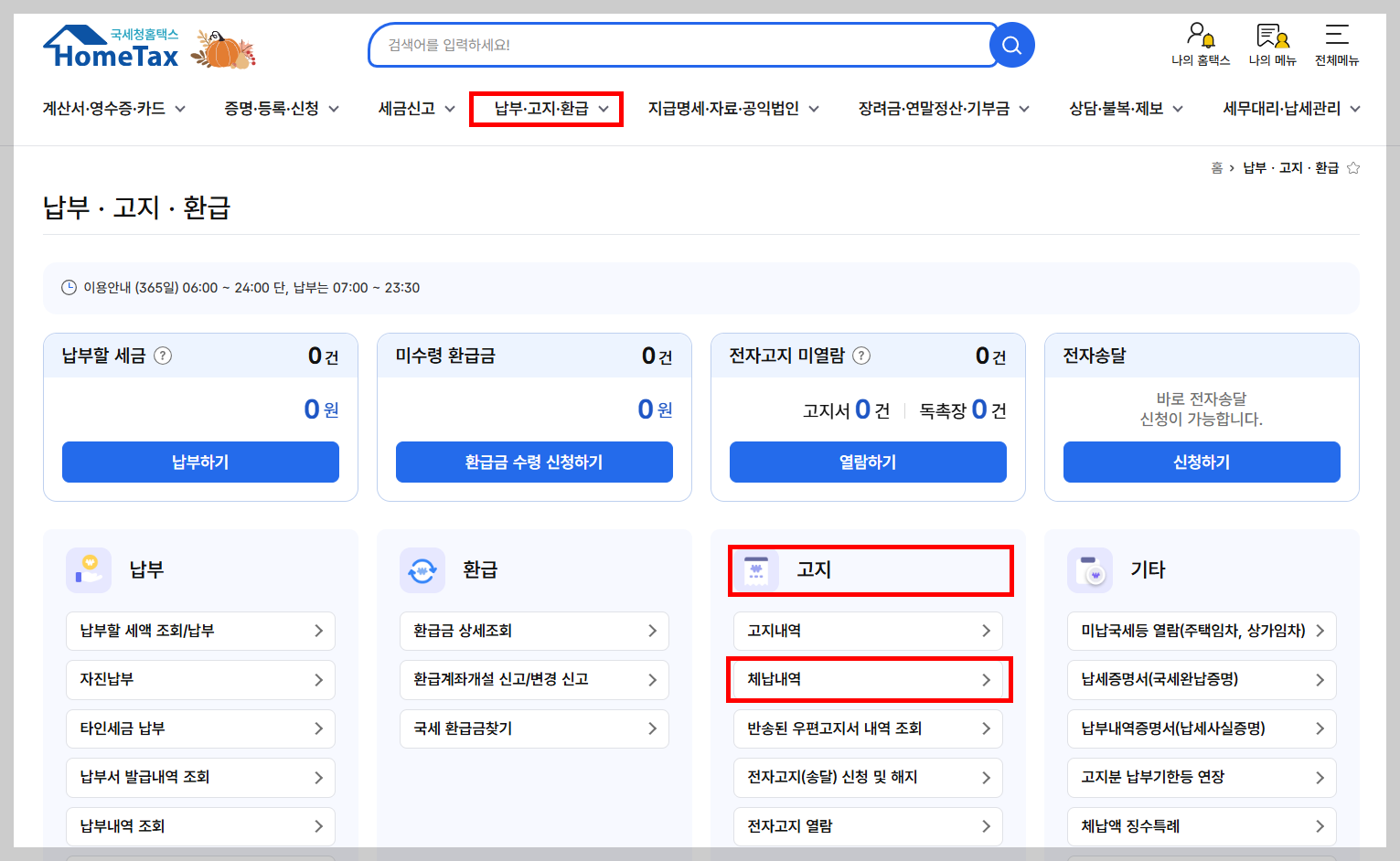 ① 🔗홈택스 → 로그인 → 납부·고지·환급 → 고지 → 체납내역