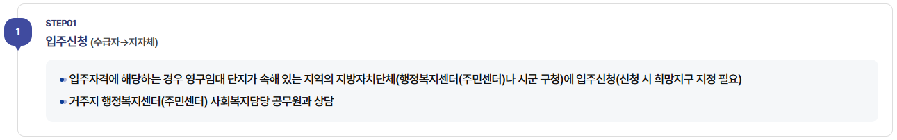 - 입주신청 (신청자→지자체) : 영구임대주택 입주자격을 갖춘 경우, 영구임대 단지가 속해 있는 지역의 지방자치단체 (거주지 행정복지센터)에 입주 신청