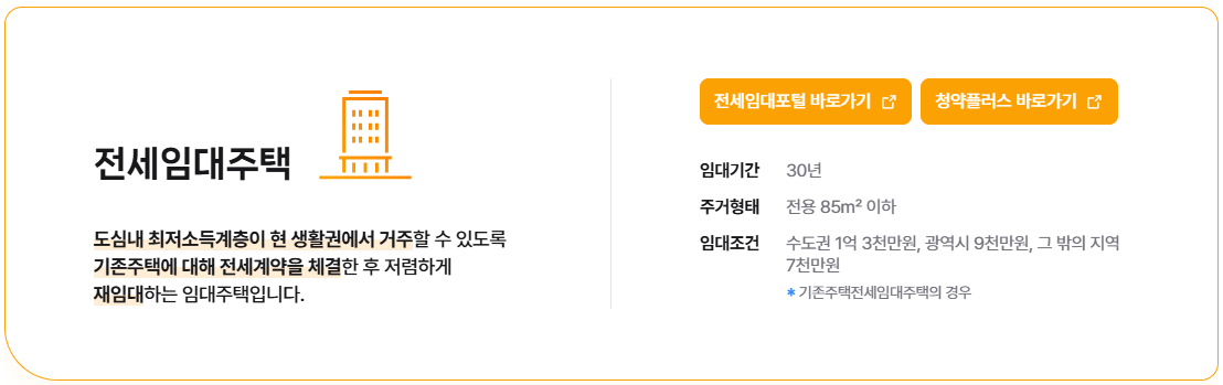 | 기존전세 입주대상 | 부도 공공임대 퇴거자, 보증거절자, 주거비 과중 가구 등 긴급 주거지원 필요 가구 |