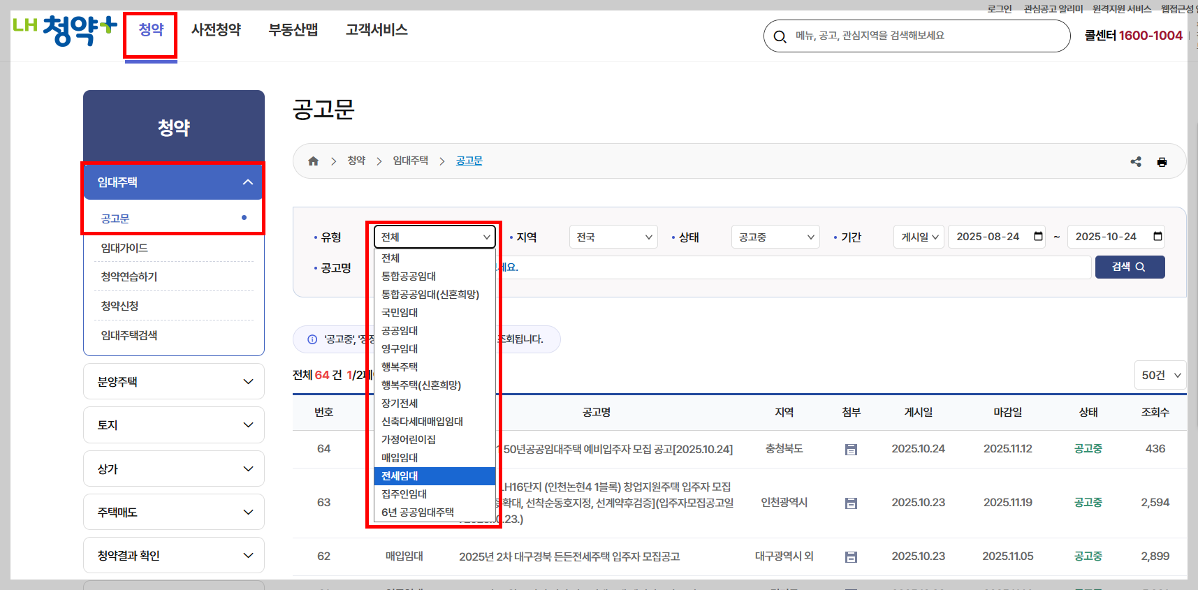 - 메인페이지 내 '청약' 배너 클릭 > 임대주택 > 모집공고 > 목록 상단에서 '전세임대' 유형 선택 > 검색 버튼 클릭