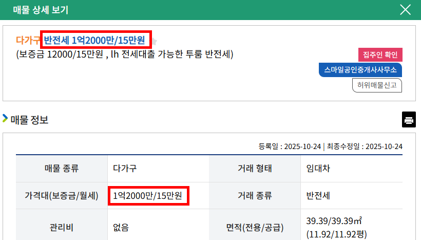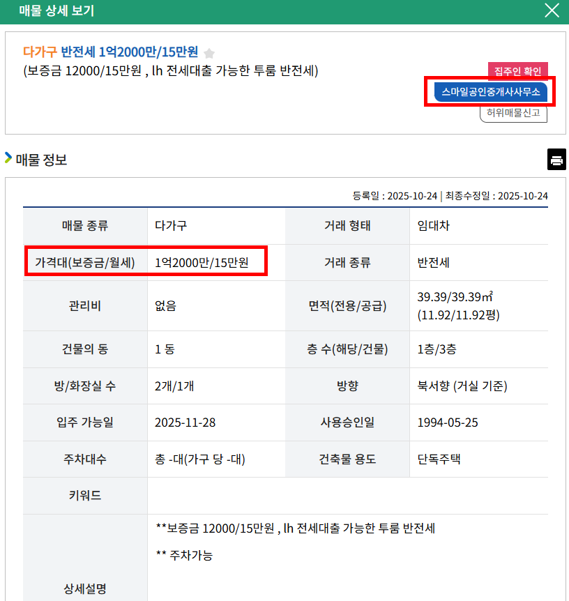 5. 매물 팝업 우측 상단 > 공인중개사 버튼 클릭하면 연락처 정보 나옴