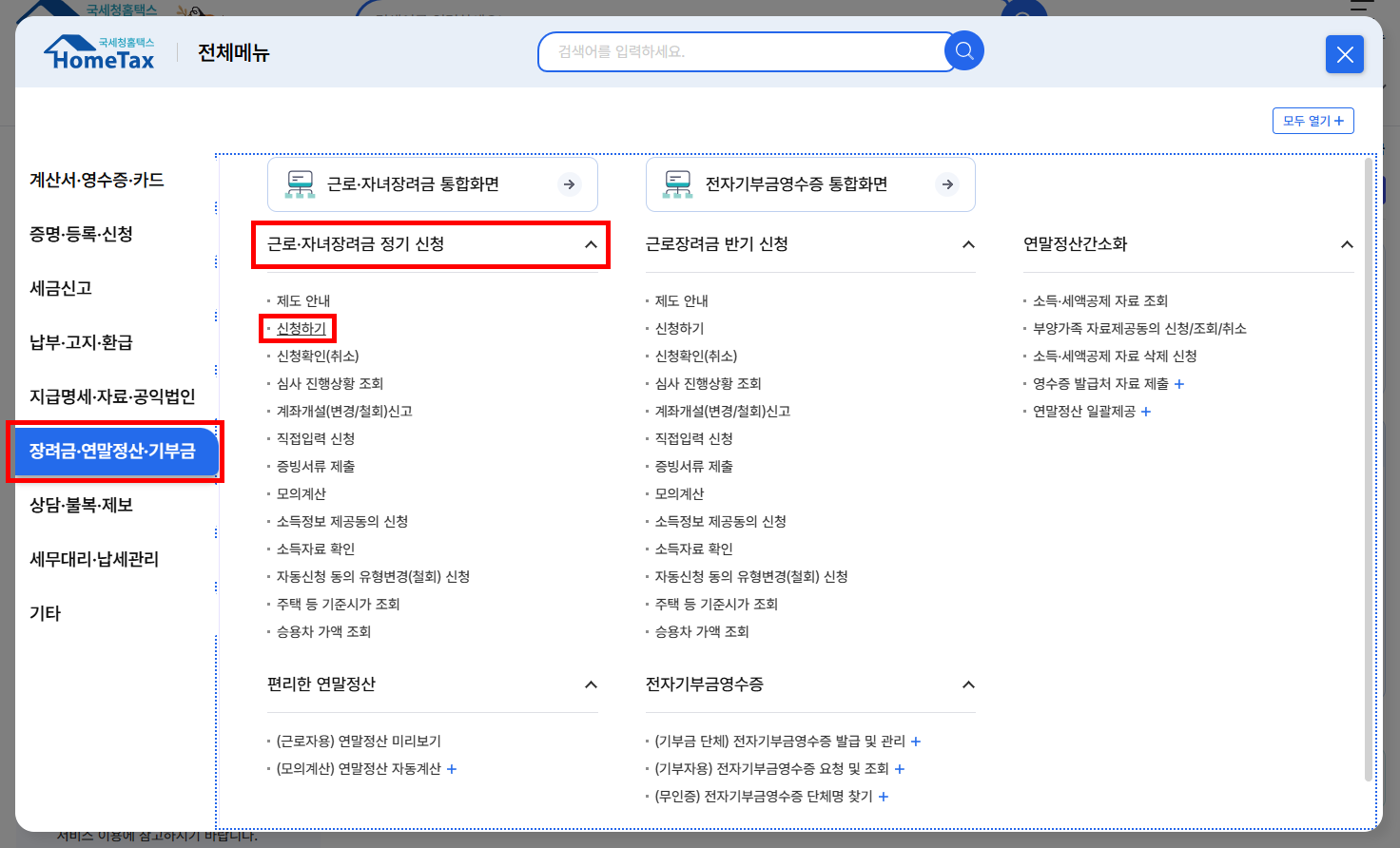 | 신청 경로 | 홈택스 > 전체메뉴 > 장려금·연말정산·기부금 > 근로·자녀장려금 정기(반기) 신청 > 신청하기 |