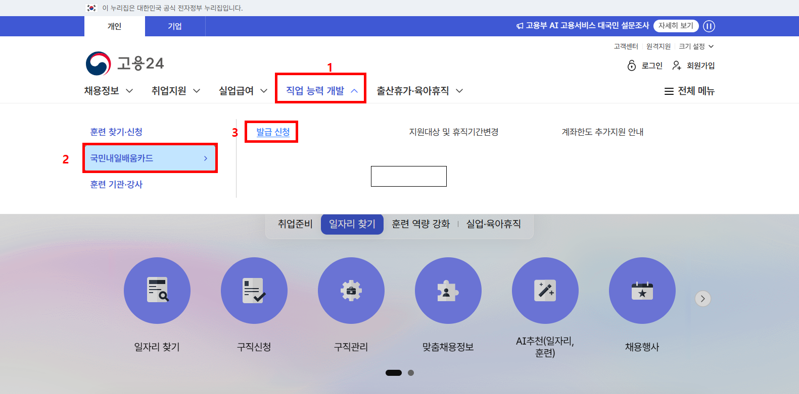 - 직업 능력 개발 → 국민내일배움카드 → 발급신청