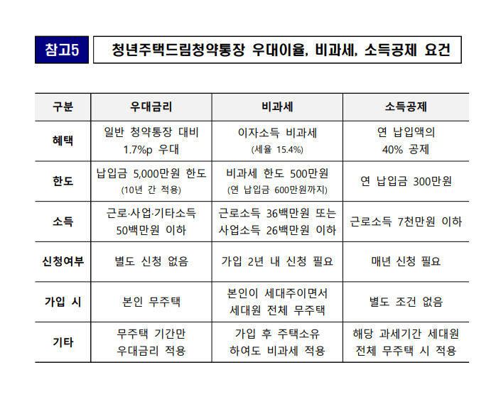 장기적으로 보면 우대금리 + 비과세 + 소득공제 조합이 매우 유리함. - 소득이 5,000만 원 이하이고, 무주택 상태인 사람