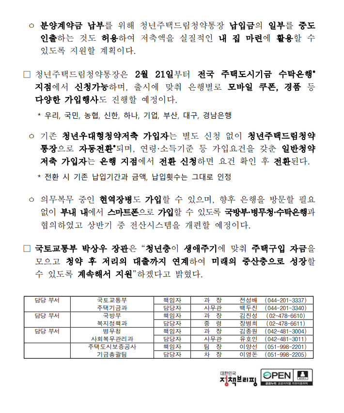 - 신청 자격 : 청년주택드림청약통장 1년 이상 가입 및 최소 1,000만 원 이상 납입 실적이 있어야 함.