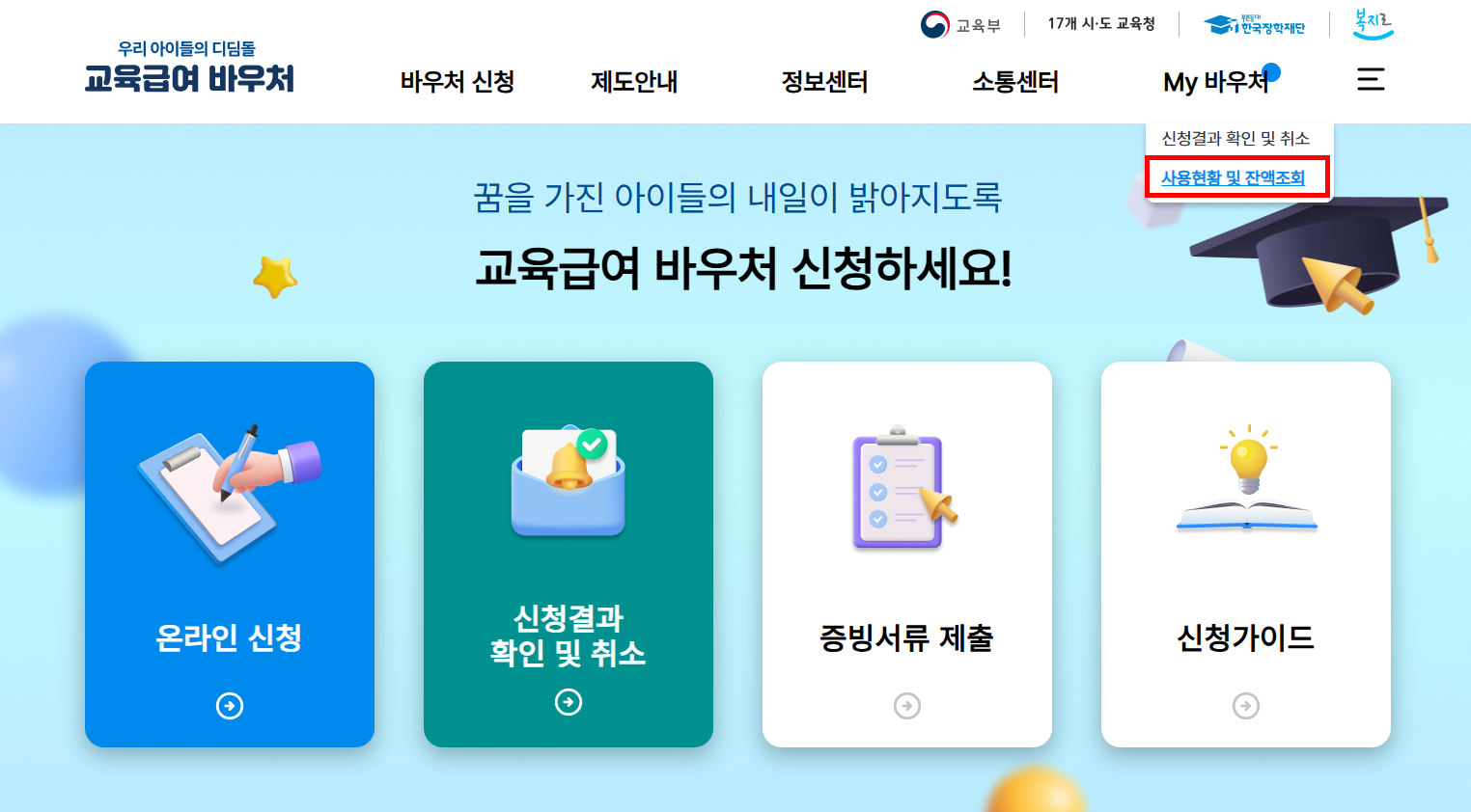 | 바우처 누리집 | 교육급여 바우처 공식 누리집 → My 바우처 → 사용현황 및 잔액조회 |