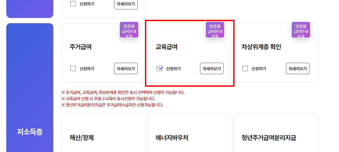 - 부양의무자 조건: 교육급여는 별도의 부양의무자 조건 없음 → 진입 장벽 낮음