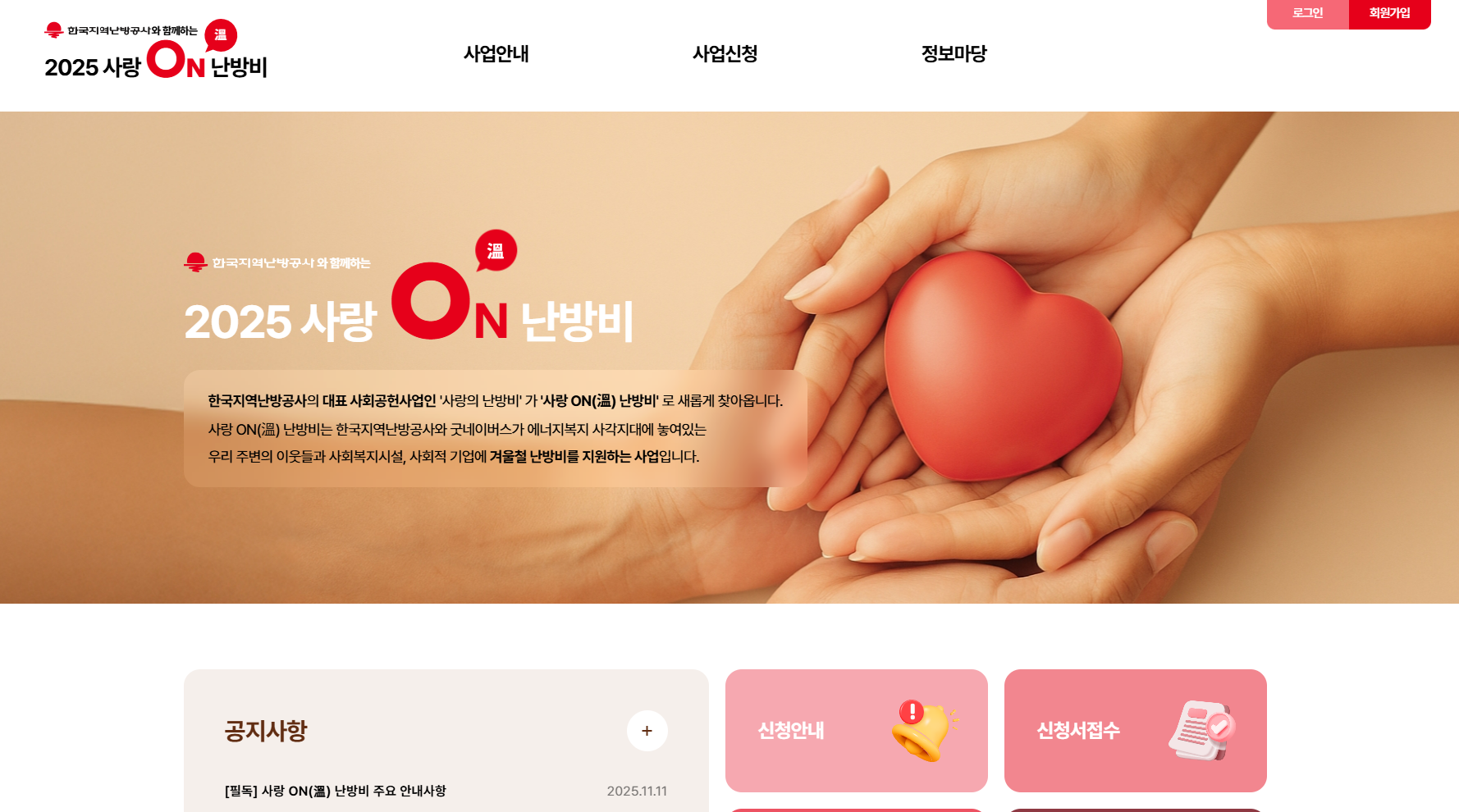 | 신청방법 | 기관 명의로 사랑ON(溫) 난방비 홈페이지 회원가입 후 신청서 및 필수 서류 제출 ※ 신청 내용에 허위사실 기재 시 선정 취소 가능 |