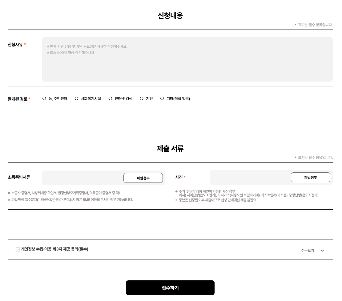 | 제출서류 | - 주민등록등본 - 사진 : 주거 및 난방 상황이 확인 가능한 사진 - 개인정보 개인정보 수집·이용 동의 : 신청서 제출 시 자동 발급 - 소득증빙서류(저소득 대상자) - 선택 : 수급자 증명서, 차상위계층 확인서, 법정한부모가족증명서, 의료급여 증명서 등 택 1 |