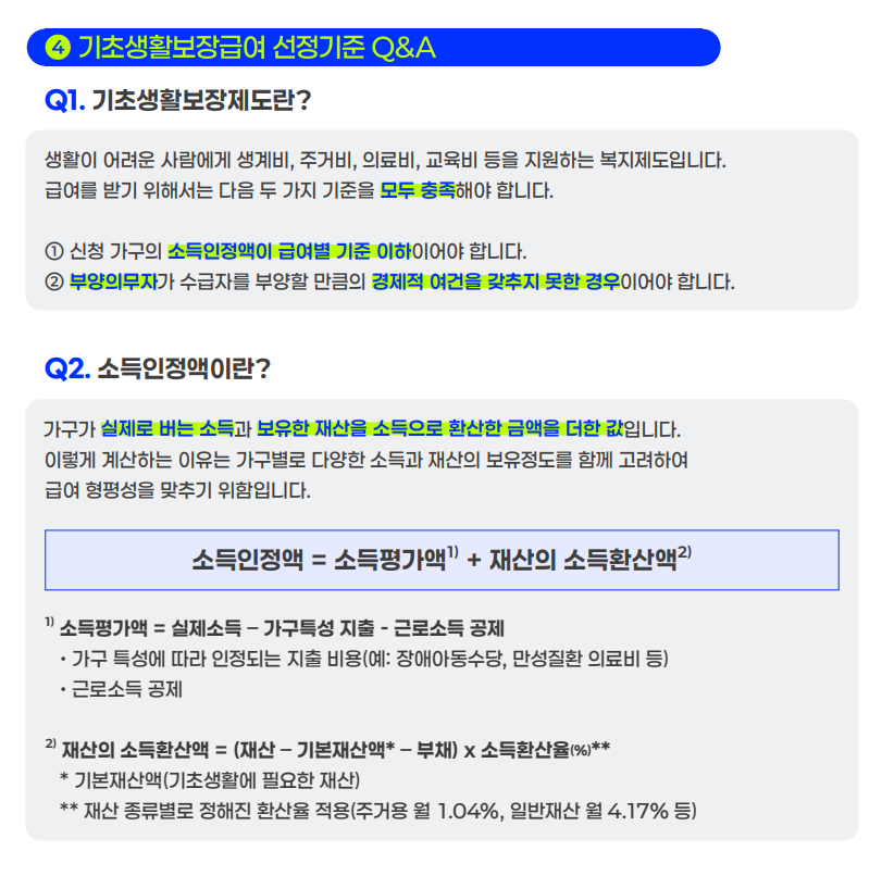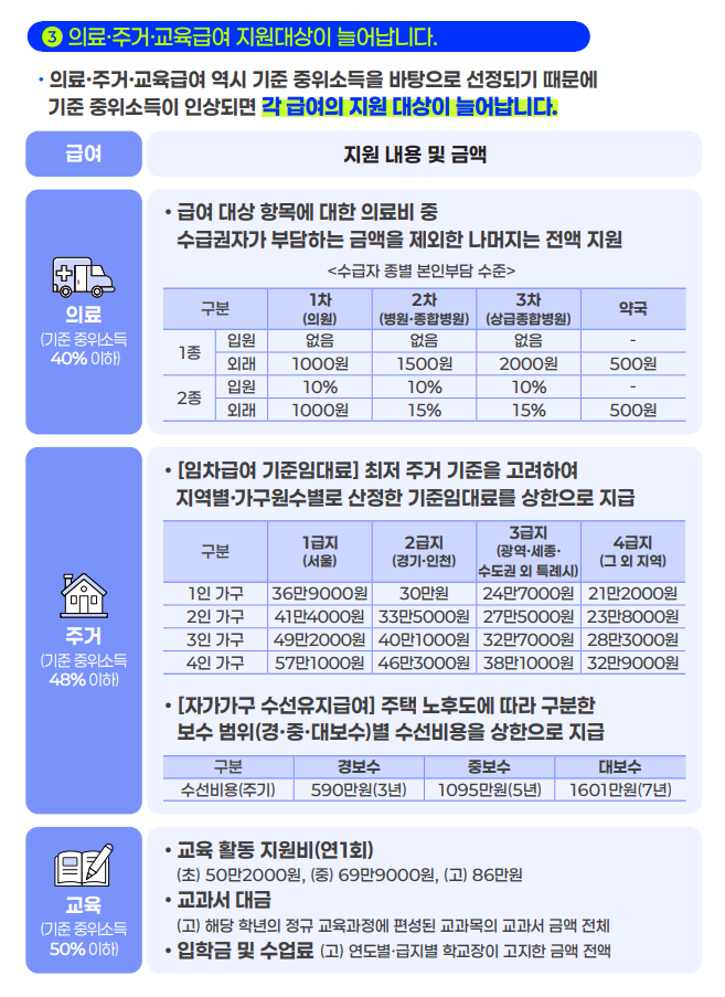 - 30~50% 이하: 기초생활보장 4대 급여(생계·의료·주거·교육)