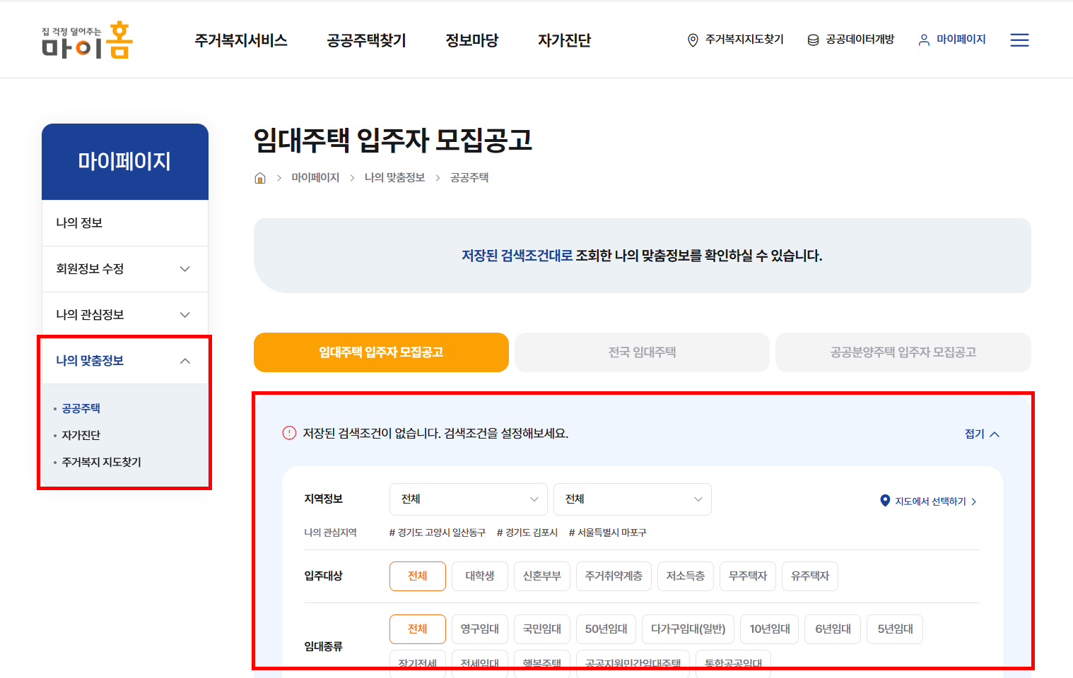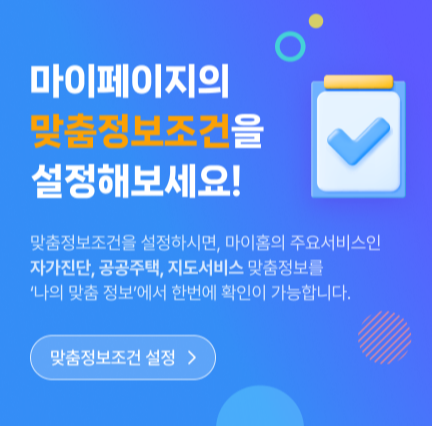 임대주택은 종류도 많고 자격 조건도 다양해서, 어떤 제도가 나에게 맞는지 직접 찾기 어려운 경우가 많습니다. 이럴 땐 마이홈포털의 🔗자가진단 서비스를 활용해보세요.