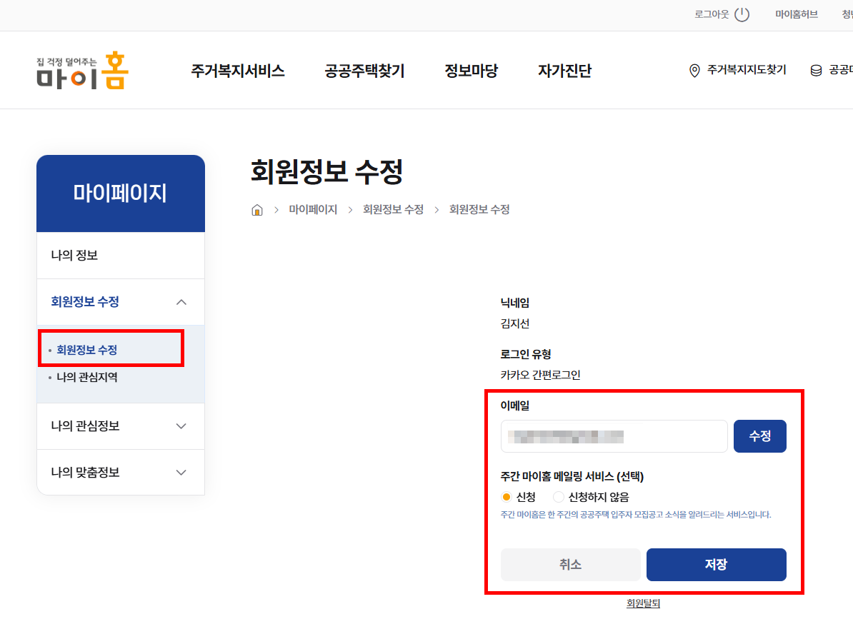 - 마이페이지 > 회원정보수정 > 주간 마이홈 메일링 서비스 신청 > 저장