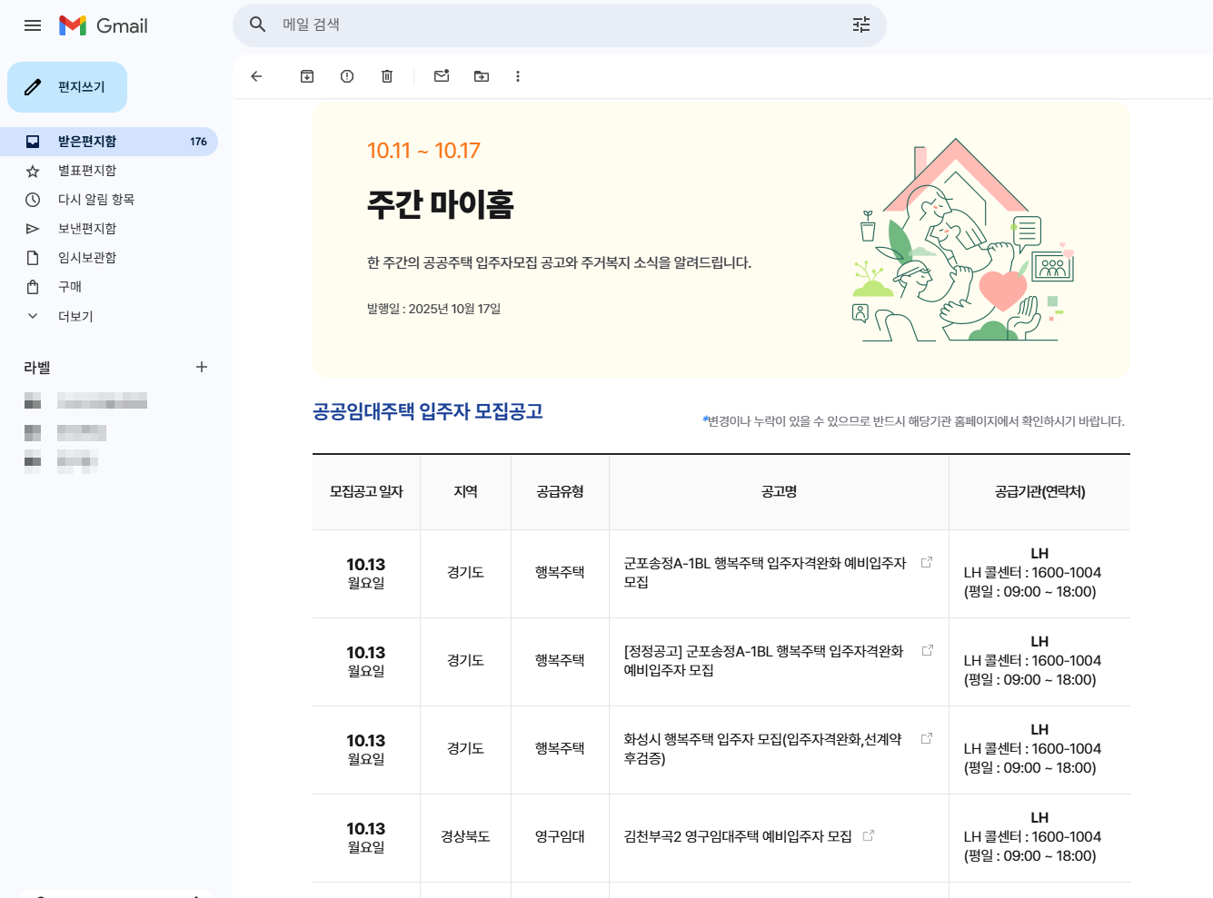 임대주택 공고는 유형, 지역, 시기에 따라 수시로 다르게 올라오기 때문에 자주 확인하지 않으면 기회를 놓치기 쉽습니다. 이럴 때는 마이홈포털의 주간 마이홈 메일링 서비스를 신청해보세요. 설정 후에는 한 주간의 공공주택 입주자모집 공고와 주거복지 소식을 메일로 받아볼 수 있어요.